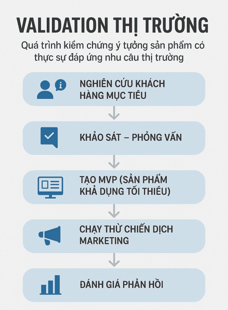 Validation thị trường (Market Validation) là quá trình kiểm chứng xem sản phẩm/dịch vụ có thực sự phù hợp với nhu cầu thị trường hay không trước khi doanh nghiệp đầu tư nhiều nguồn lực.